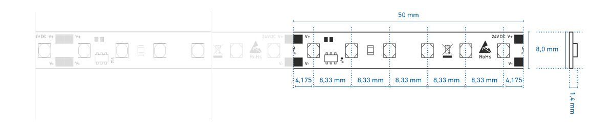 System: CV Farbtyp: white LED/Meter: 120/m Pitch: 8 Schnittlänge: 5 cm Anschlussart: Löten Abstrahlwinkel: 120° Dimmbar: ja Lebensdauer L70: >60000h Farbkonsistenz: 3 Max. Gehäuse-Temperatur: 80° Schutzart: IP00